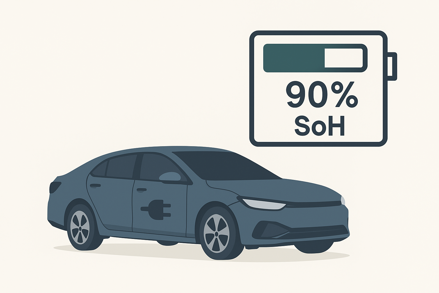 SoH(State of Health)는 배터리의 현재 상태를 퍼센트(%)로 나타낸 지표로, 새 배터리 대비 성능이 얼마나 남아 있는지를 보여줍니다. 예를 들어 SoH가 90%라면, 해당 배터리는 새것 대비 90%의 성능을 유지하고 있다는 뜻입니다. 이는 단순히 충전량(SOC: State of Charge)과는 다른 개념으로, 충전 상태가 80%라도 SoH가 95%일 수 있습니다. SoH는 전기차 배터리의 실제 수명과 직결되기 때문에 특히 중고 전기차 구매 시 매우 중요한 판단 요소로 간주됩니다. 배터리는 시간이 지나면서 화학적 노화가 진행되어 점차 용량이 줄어듭니다. 이때 SoH는 전압, 전류, 온도 등의 다양한 데이터를 분석해 배터리의 건강 상태를 추정합니다. 완전히 동일한 주행 거리의 차량이라도 SoH 수치는 달라질 수 있으며, 운전 습관, 충전 방식, 주행 환경 등이 SoH에 영향을 미칩니다. 예를 들어 급속 충전을 자주 사용하거나, 배터리를 자주 0%까지 소모시키는 경우 SoH가 빠르게 저하될 수 있습니다. 이처럼 SoH는 배터리의 남은 성능을 종합적으로 보여주는 핵심 지표입니다. 전기차를 구매하거나 중고차 거래 시, 반드시 SoH 수치를 확인하고 차량 상태를 파악하는 것이 중요합니다.